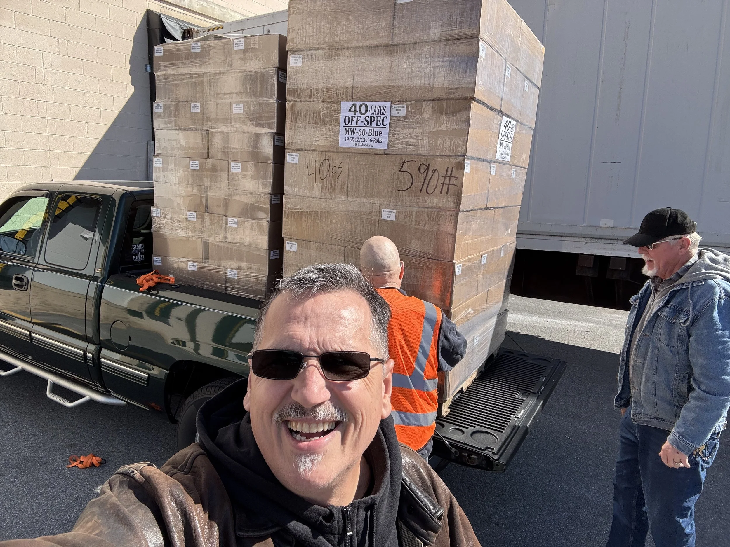 Picking up 2 double pallets of dry disinfectant wipes from a local food bank to bless the folks in Paintsville Kentucky after 22 died from catastrophic flooding in February 2025.